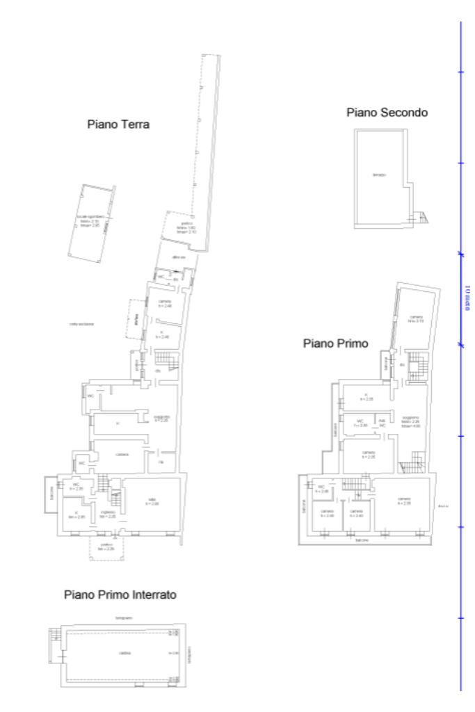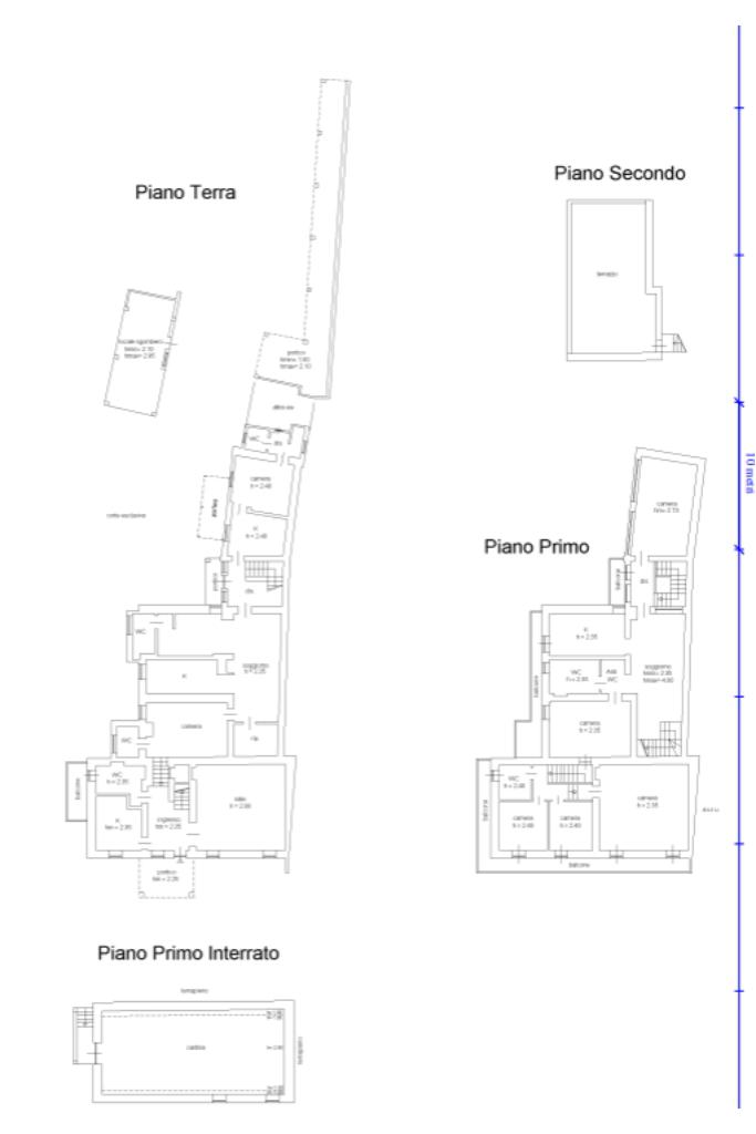 - nel secondo blocco: disimpegno, soggiorno, due cucine, due camere e tre bagni al piano terra; due camere, una cucina, un bagno, un soggiorno al primo piano.