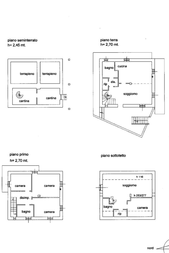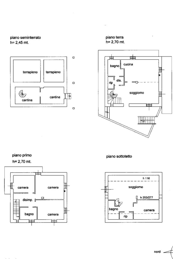 La proprietĂ  si struttura su quattro livelli, che prevedono rispettivamente: soggiorno, cucina e bagno al piano terra; tre camere da letto ed un bagno al primo piano; soggiorno, studio e bagno al secondo piano mansardato; una cantina al piano interrato.